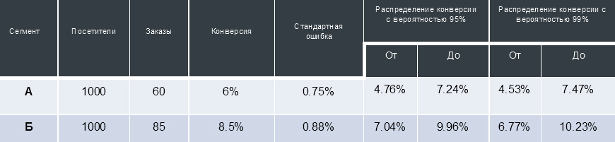 Для таблицы выше это означает, что если мы приведем еще 1000 пользователей на версию сайта «А» при неизменных внешних условиях, то с вероятностью 99% эти пользователи сделают от 45 до 75 заказов (то есть сконвертируются в покупателей с коэффициентом от 4.53% до 7.47%).