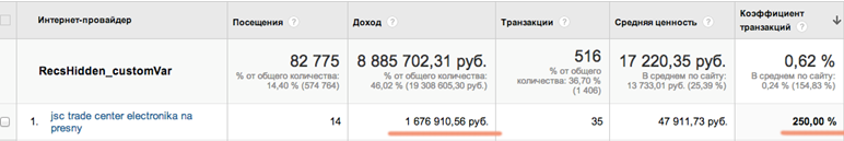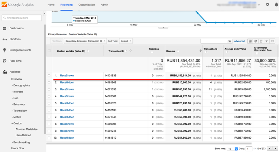 На скриншоте продемонстрирован очередной пример A/Б-теста Retail Rocket, при котором в один из сегментов попал заказ на сумму более миллиона рублей: