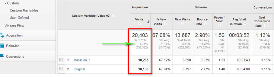 На скриншоте видно, что суммарно в тесте приняло участие чуть менее 6% аудитории. Крайне важно, чтобы вся аудитория сайта относилась к одному из сегментов теста, в противном случае невозможно оценить влияние изменения на бизнес в целом.