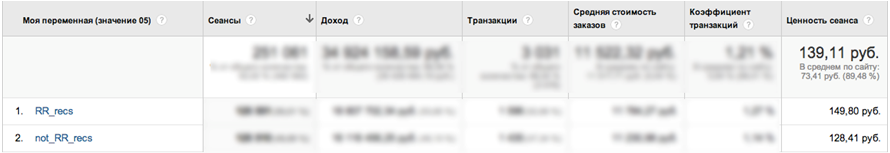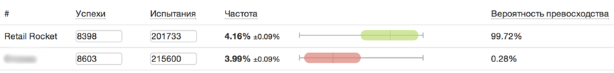 Вот пример А/Б-теста, в котором система Retail Rocket сравнивалась с другой рекомендательной системой: