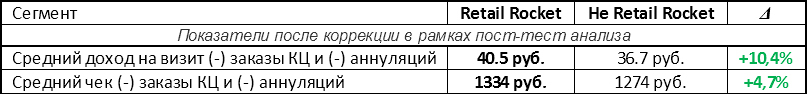 Сегмент «не Retail Rocket» побеждает по всем параметрам. Однако, в рамках следующего этапа пост-тест анализа были исключены заказы call-центра, а также аннулированные заказы. Результаты: