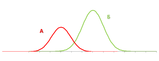 Сама по себе эта информация не слишком ценная, однако, при проведении А/Б-теста мы можем получить 2 интервала распределения конверсии. Сравнение пересечения так называемых «доверительных интервалов» конверсий, получаемых от двух сегментов пользователей, взаимодействующих с разными версиями сайта, позволяет принять решение и утверждать, что один из тестируемых вариантов сайта статистически достоверно превосходит другой. Графически это можно представить так:
