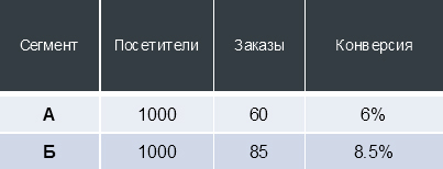 Кроме того, обратите внимание на последний столбец: видно, что во второй сегмент попадает больше повторной, а значит и более лояльной аудитории. Такие люди будут совершать больше заказов и исказят результаты тестирования. И это ещё один признак некорректной работы инструмента тестирования.