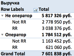 В любом случае, всегда можно выгрузить заказы из Google Analytics и присвоить им свойство «оформлен оператором» или «оформлен не оператором». После чего построить сводную таблицу как на скриншоте, отражающую другую ситуацию, с которой мы сталкиваемся довольно часто: если взять выручку сегмента RR и Not RR («сайт с Retail Rocket» и «без» соответственно), то «сайт с Retail Rocket» приносит меньше денег, чем «без». Но если выделить заказы, оформленные операторами call-центра, то окажется, что Retail Rocket дает прирост выручки на 10%.