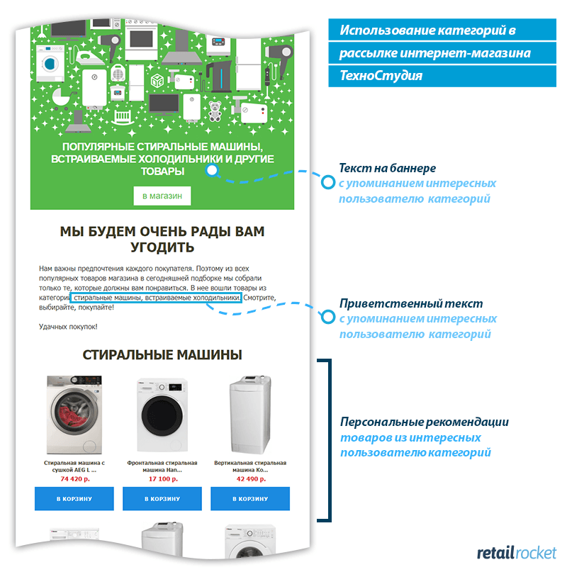 Внутри рассылки название категории используется и на баннере и в приветственном тексте. Вот так, например, выглядит письмо для подписчика с интересом к стиральным машинам и встраиваемым холодильникам: