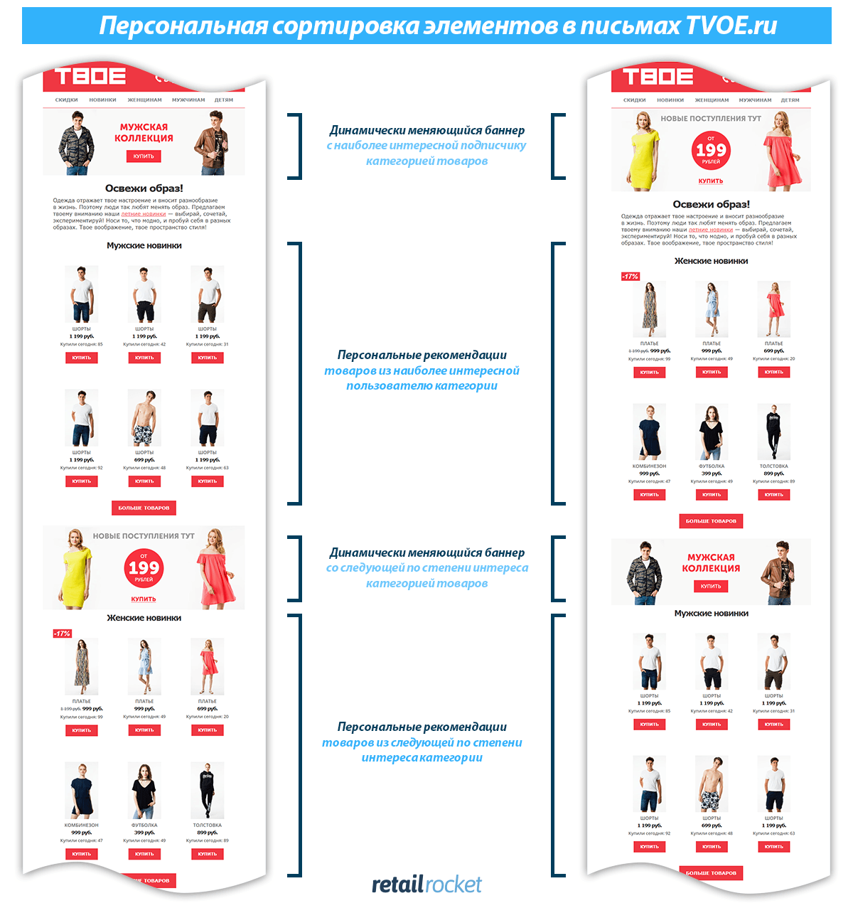 Например, интернет-магазин ТВОЕ сортирует блоки с мужской и женской коллекциями в зависимости от интереса пользователя: