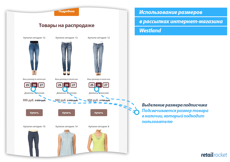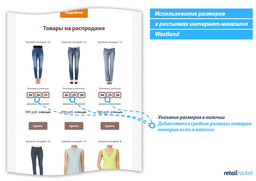 Если клиент когда-либо совершал покупку, у интернет-магазина есть данные о размере, а значит, эту информацию можно использовать не на этапе добавления в корзину, а в момент предложения товара. В нашем случае — в email-рассылках. Причем можно как исключать товары, которых нет в нужном размере, так и просто выделять подходящие размеры.