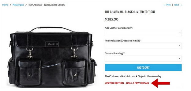 Но не обязательно иметь звездный статус, чтобы использовать лимитированные коллекции. Например, бренд Brothers Leather Supply уведомляет своих онлайн-посетителей, когда продукция из их эксклюзивной коллекции подходит к концу, чтобы форсировать продажи.
