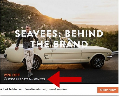 Обратный отсчет может быть использован в виде действия специальной цены в течение конкретного промежутка времени. Например, компания Huckberry напоминала покупателям о том, что установленная скидка в 25% действует строго до окончания обратного отсчета.