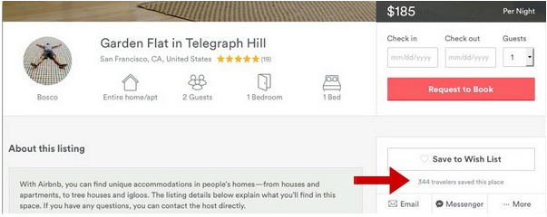 Компания Airbnb в качестве социального доказательства показывает количество путешественников, добавивших отель себе в закладки.