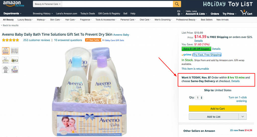 Подобный формат таймера, наряду с другими трюками, активно использует Amazon, чтобы сообщить покупателям о том, что при покупке в течение нескольких часов (а иногда и минут) доставка будет осуществлена в этот (или на следующий) день.