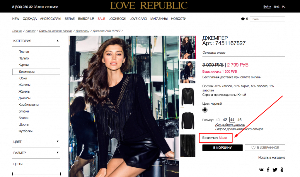 Этим же способом пользуются многие другие ритейлеры, при этом не всегда обязательно указывать точное количество, например, интернет-магазин Love Republic использует варианты «много», «есть» или «мало», чтобы показать наличие товара на складе. Когда покупатель видит, что товар практически распродан, это становится дополнительным стимулом к совершению покупки.