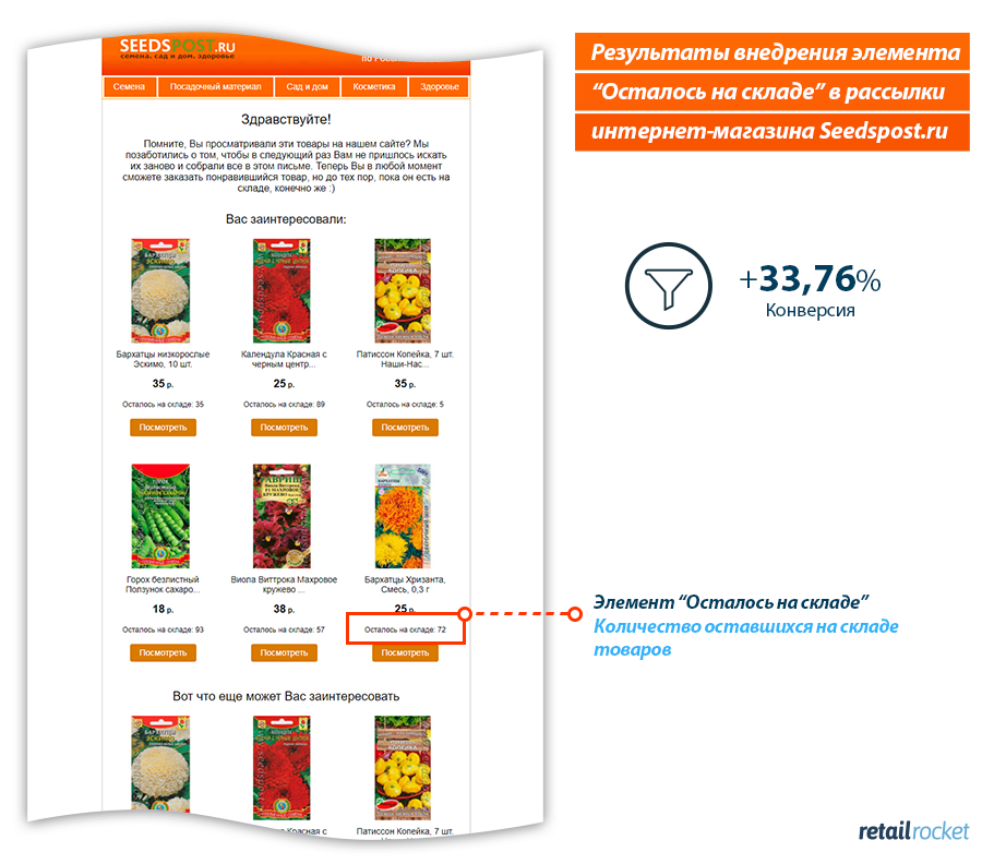 Ограничение количества товара можно использовать не только на сайте, но и в email-рассылках, например, интернет-магазин Seedspost увеличил конверсию триггерных писем по сценарию «брошенный просмотр» на 33,76% с помощью внедрения элемента «Осталось на складе»: