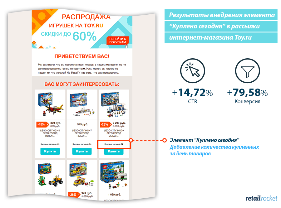 Интернет-магазину товаров для детей Toy.ru внедрение элемента «Куплено сегодня» в шаблон email-рассылок принесло увеличение показателя CTR на 14,72% и повысило конверсию на 79,58%.