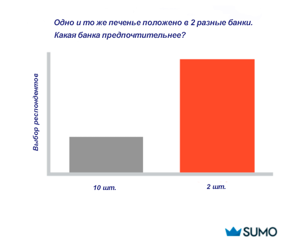 Эксперимент проводился в два этапа: сначала в каждой из банок находилось по 10 штук одного и того же вида печенья. Оценки аудитории распределились примерно одинаково. На втором этапе в одной из банок оставили только 2 штуки. На этот раз предпочтения аудитории с большим перевесом были отданы банке, в которой было 2 печенья.