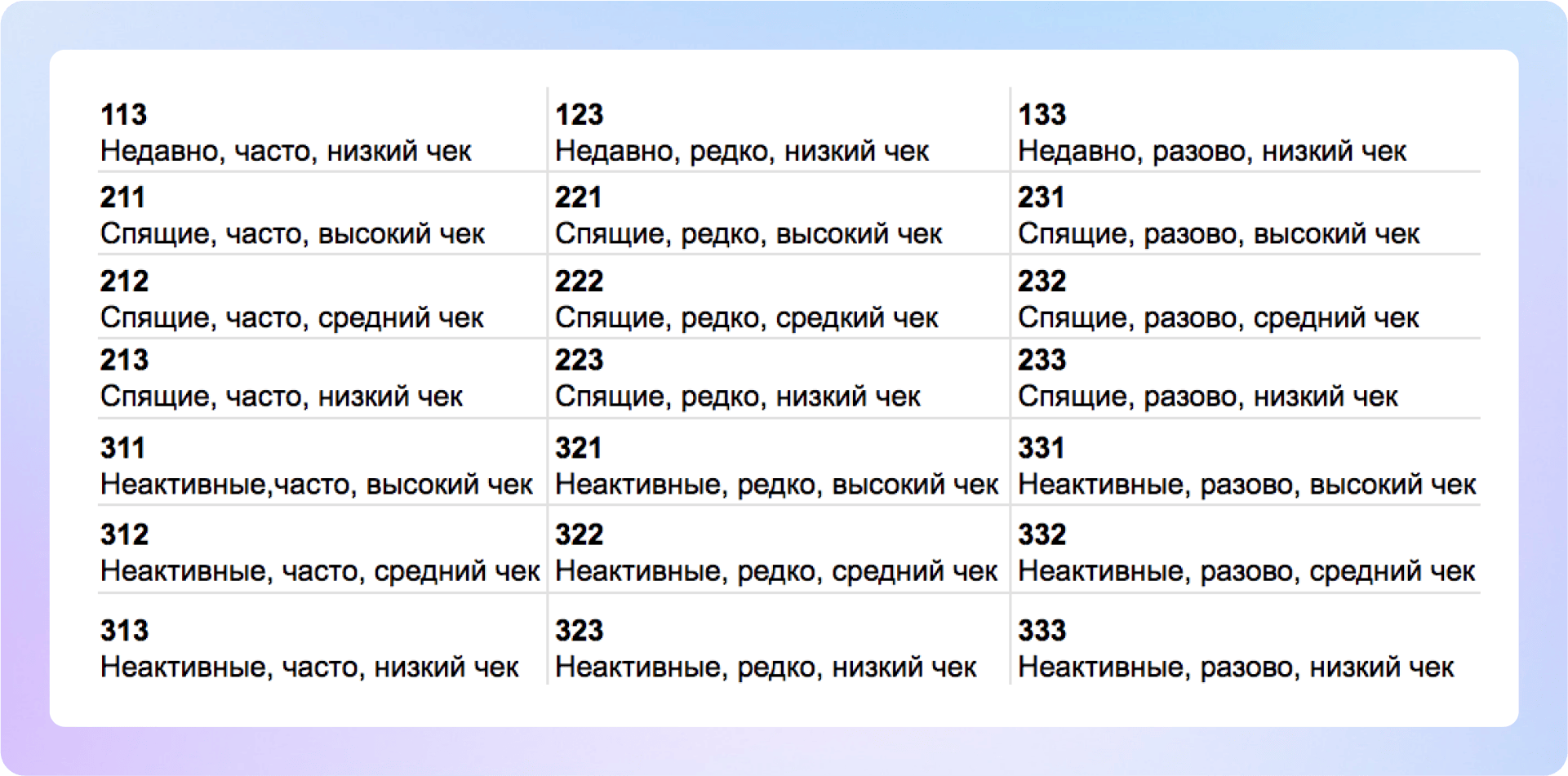 Чтобы создать сегменты, нужно скомбинировать оценки, например, 111 — идеальные, 313 — неактивные. пограничных сегментов три: