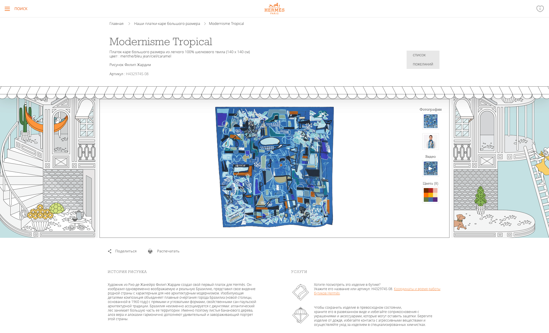 Рассказывайте историю бренда или более конкретные детали. Такие вещи позволяют проникнуться атмосферой, окунуться в более тонкие ощущения и приобщиться к ценностям компании. Например, на сайте Hermes есть информация о происхождении каждого рисунка.