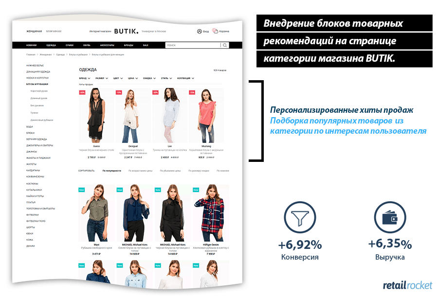 В онлайне эту роль выполняют персональные рекомендации на сайте — товарные подборки на основе интересов и поведения каждого конкретного пользователя. Они позволяют создать персональный покупательский опыт, в реальном времени подстраивая сайт для каждого уникального посетителя интернет-магазина. За счет этого растет конверсия и выручка ритейлера, а клиенты чувствуют заботу к своим потребностям.