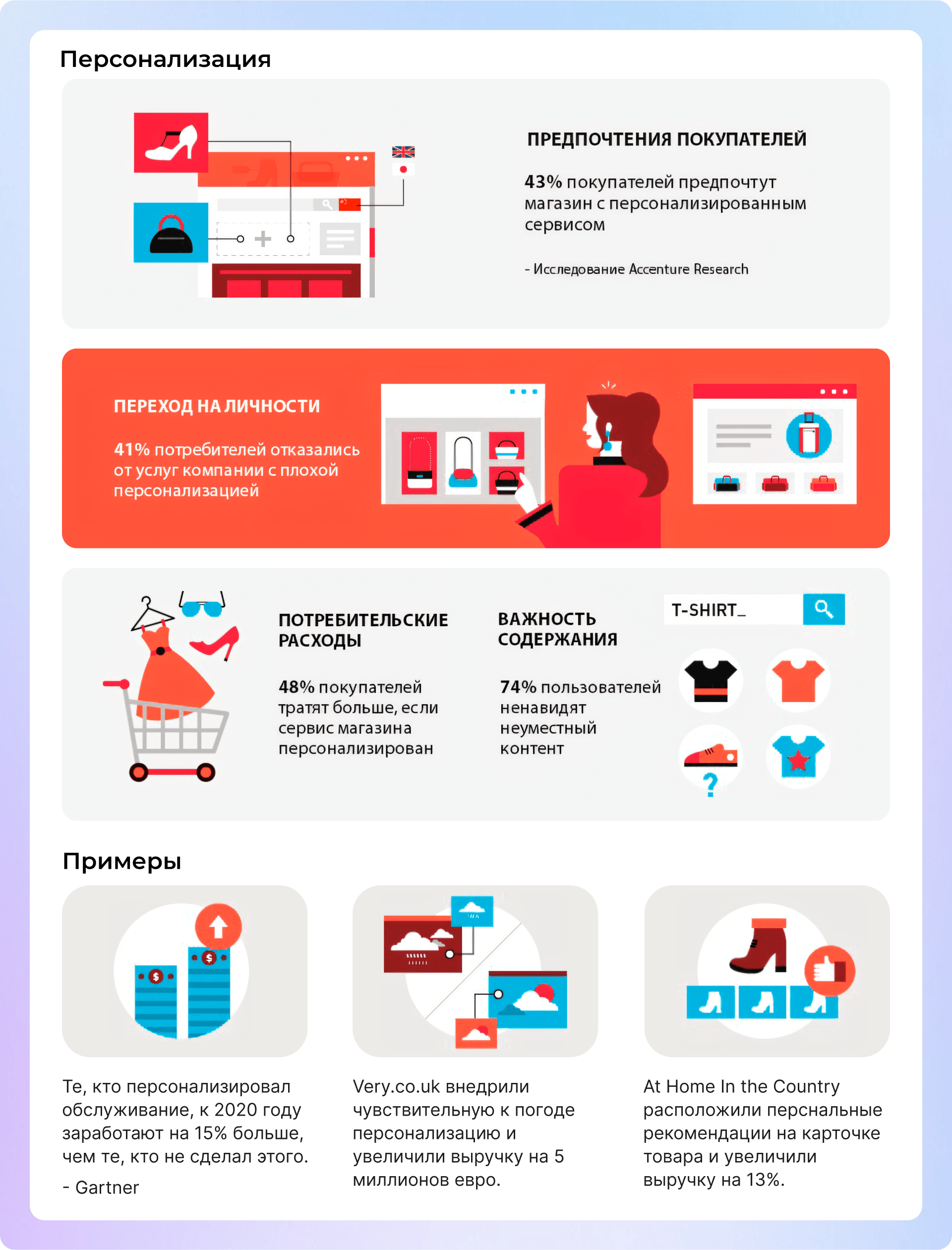 Тысячи ритейлеров уже используют персонализацию. Они точно знают, что нужно их покупателям, и показывают это. Accenture выяснили: 43% людей выбирают магазины, которые понимают их предпочтения. Если вы угадываете желания клиентов, они остаются и покупают больше.