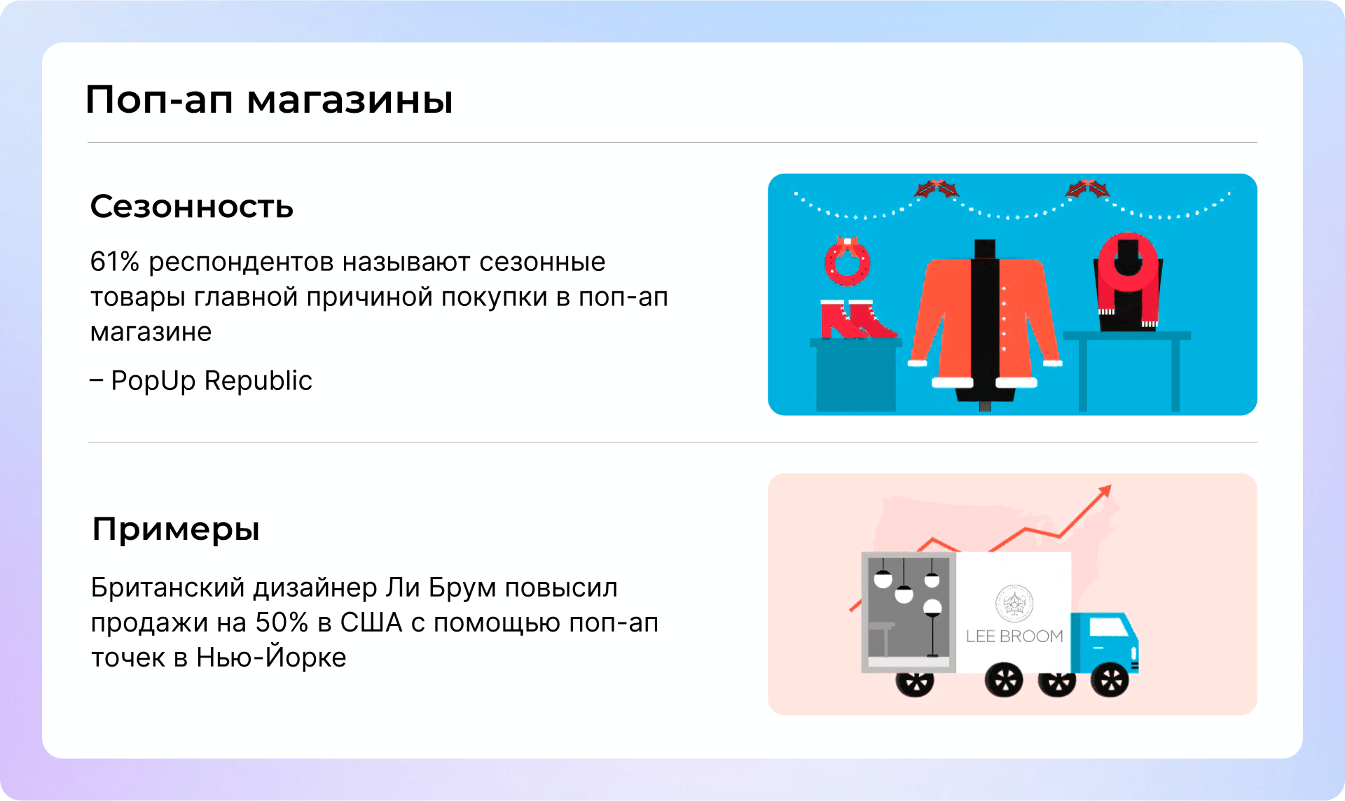 Что даст вам поп-ап точка? Дополнительные продажи без особых затрат на аренду и документацию, расширение аудитории и возможность напрямую пообщаться со своими клиентами.