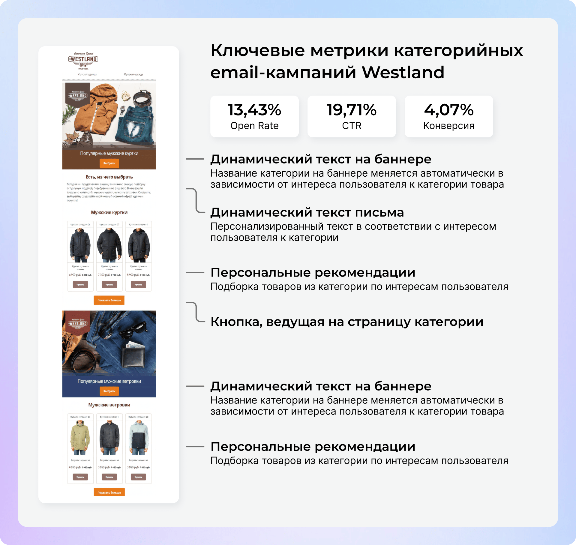 Кроме удобства, автоматизация приносит значительный профит — начиная от экономии времени сотрудников до прямых продаж и выручки, генерируемой без участия человека. Например, автоматизированные email-кампании Retail Rocket позволяют избавить email-маркетолога от рутинных операций по сбору регулярных рассылок, подбирая релевантный контент для каждого пользователя на автоматической основе.
