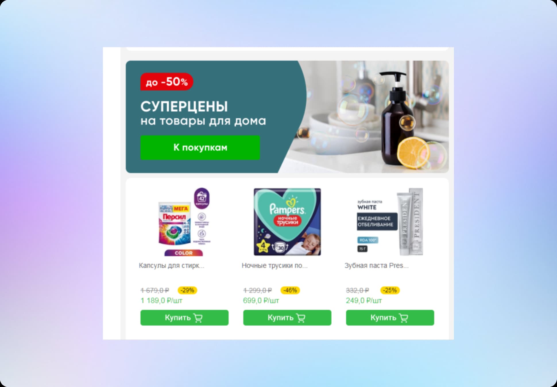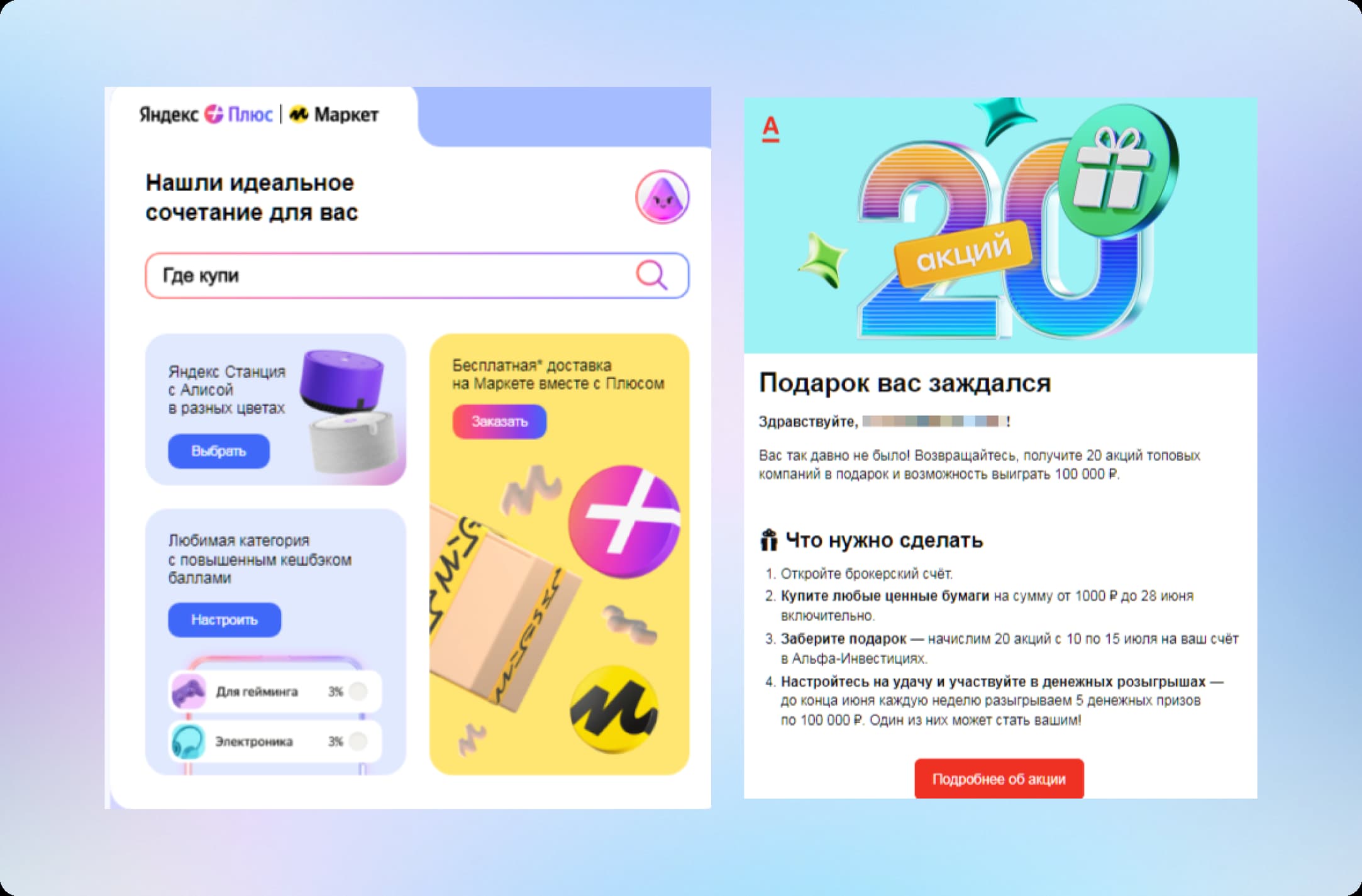 В персонализированном письме могут содержаться: имя получателя, баланс его бонусов, адрес доставки, купленные ранее продукты и другие индивидуальные параметры.