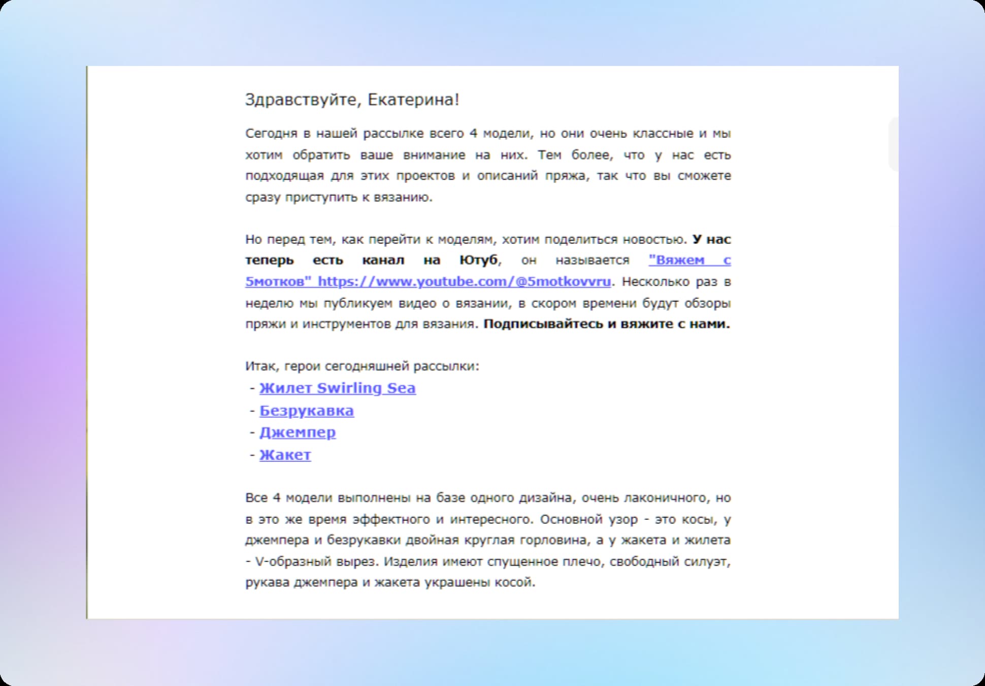 Пользователю, который давно не открывал письма компании, можно оправить контентное реанимационное письмо с полезным дайджестом. Если он не откроет его и не перейдёт по ссылкам на материалы, скорее всего, тема рассылок и услуги компании перестали быть ему актуальны. Пример такого реактивационного письма от магазина пряжи «5 мотков»: