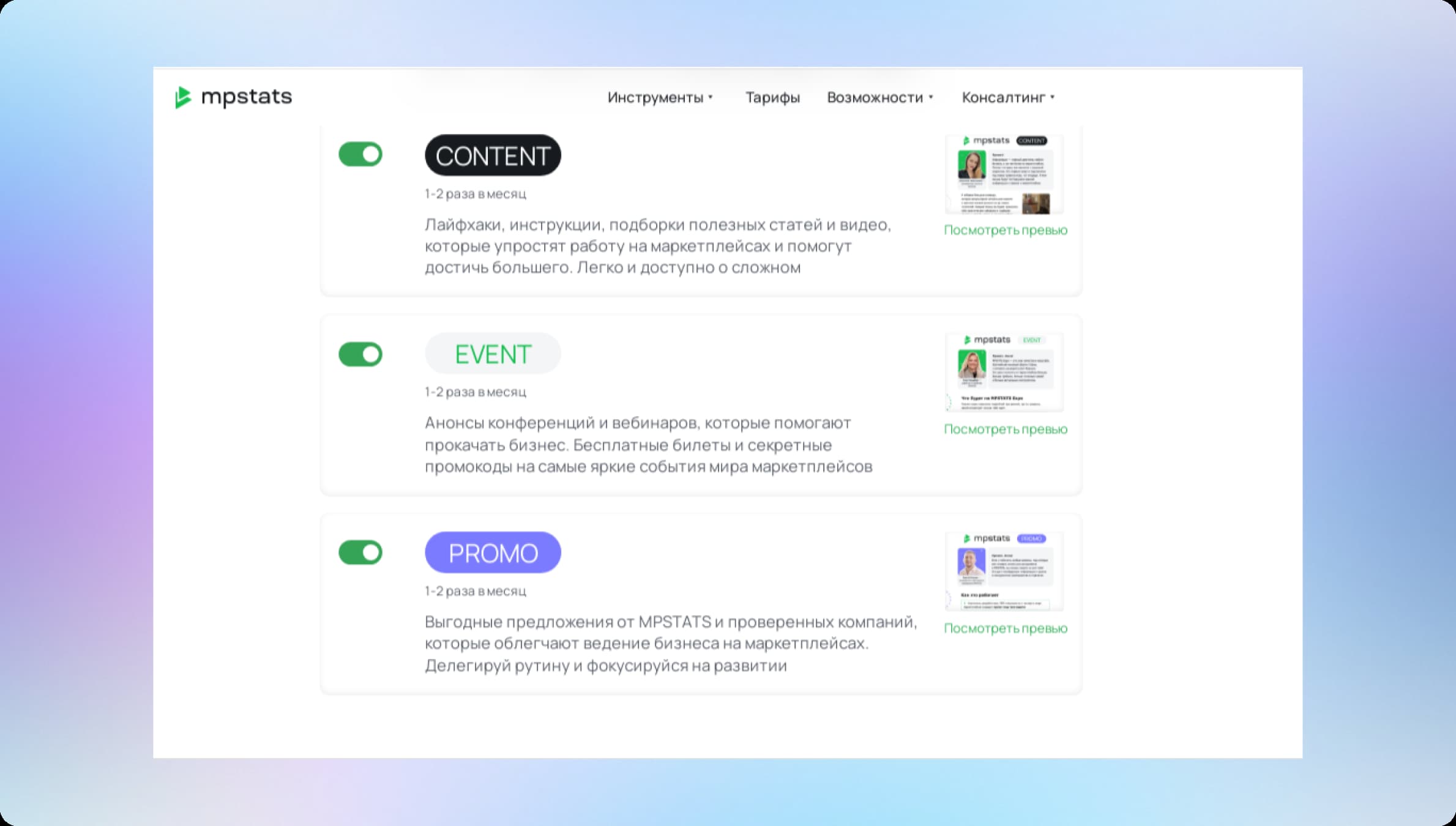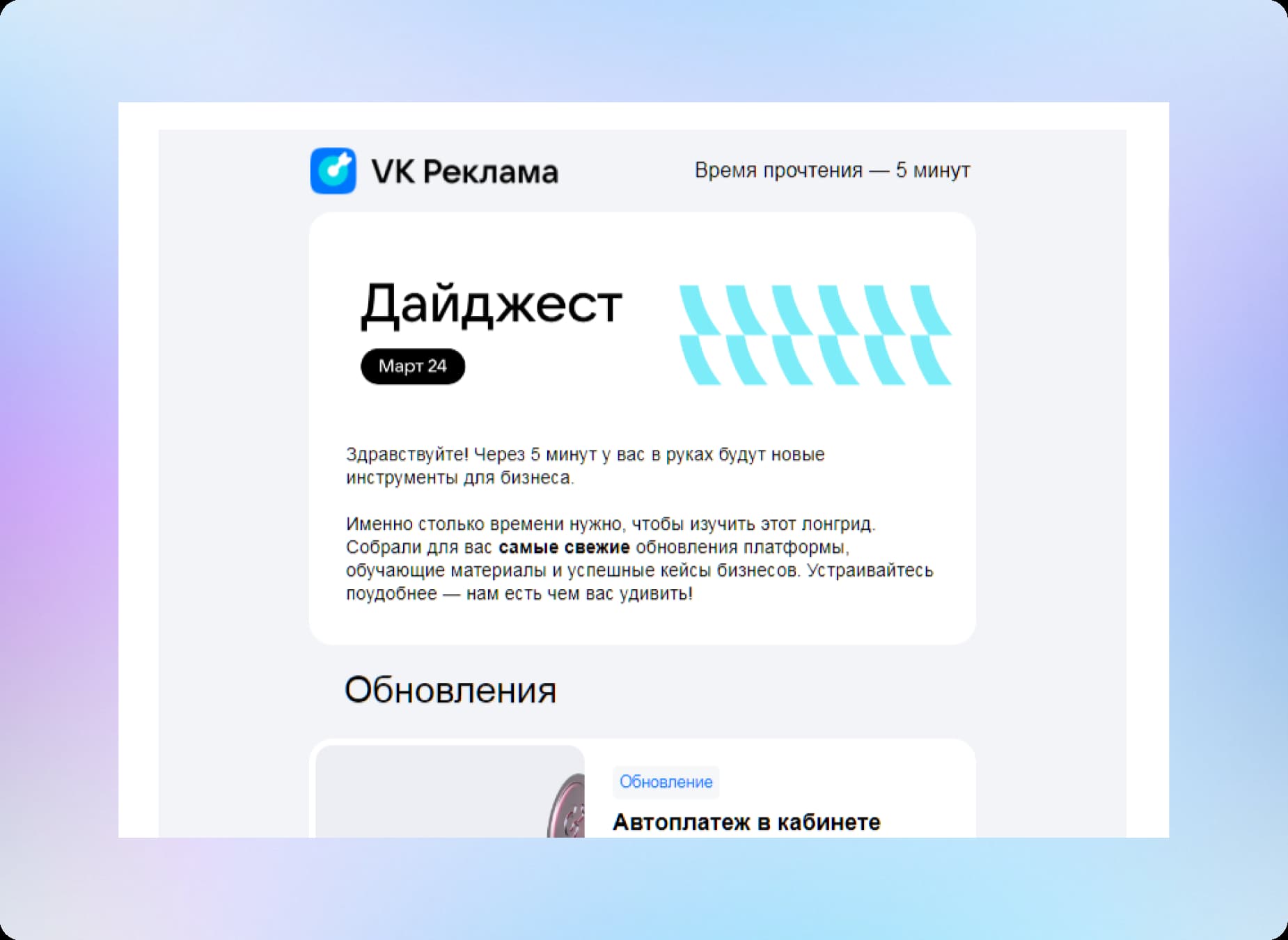 Контентные рассылки предоставляют пользователям полезную информацию без прямой продажи товаров или услуг. Их основная задача — увлечь получателей, установить доверительные отношения и подчеркнуть экспертность бренда. Благодаря этому, когда у клиента возникнет потребность, он в первую очередь вспомнит о компании и обратится именно в неё.