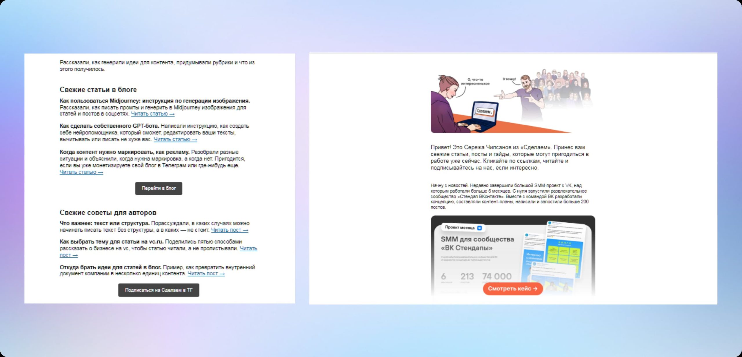 Например, агентство контент-маркетинга «Сделаем» еженедельно отправляет подписчикам рассылки — дайджесты с кейсами и статьями: