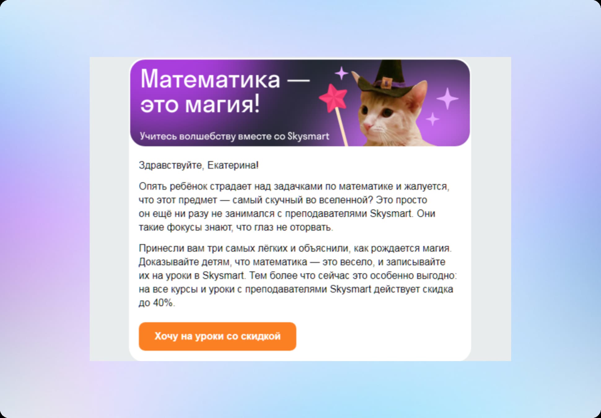 Например, в рассылке онлайн-школы Skysmart получатель видит конкретный оффер — скидку 40% на все курсы и уроки, список которых открывается после нажатия на кнопку: