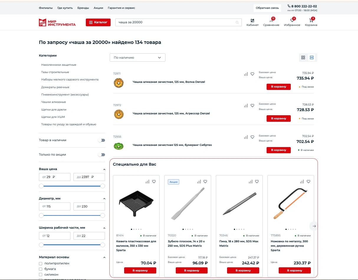 Самым конверсионным оказался блок рекомендаций «Специально для вас» в поиске — он персонализирует SERP с учётом истории покупок и интересов клиента.