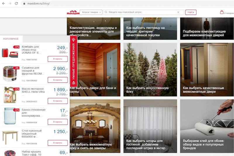 Однако стоит посетителю изучить ассортимент и проявить тем самым свои интересы, как в блоке «умные предложения» добавятся еще две вкладки: «Вы смотрели» и «Рекомендуем». Их содержимое напрямую зависит от поведения пользователя в интернет-магазине. Если клиент захочет вернуться к товару, который он недавно изучил, ему не придется вновь листать страницы на сайте. В то же время вкладка с товарными рекомендациями предложит ему только то, что соответствует его вкусам и потребностям. Таким образом, представители компании МаксидоМ могут быть уверены, что у каждого посетителя их сайта будут всегда под рукой подборки с максимально релевантными предложениями, подходящими персонально ему.