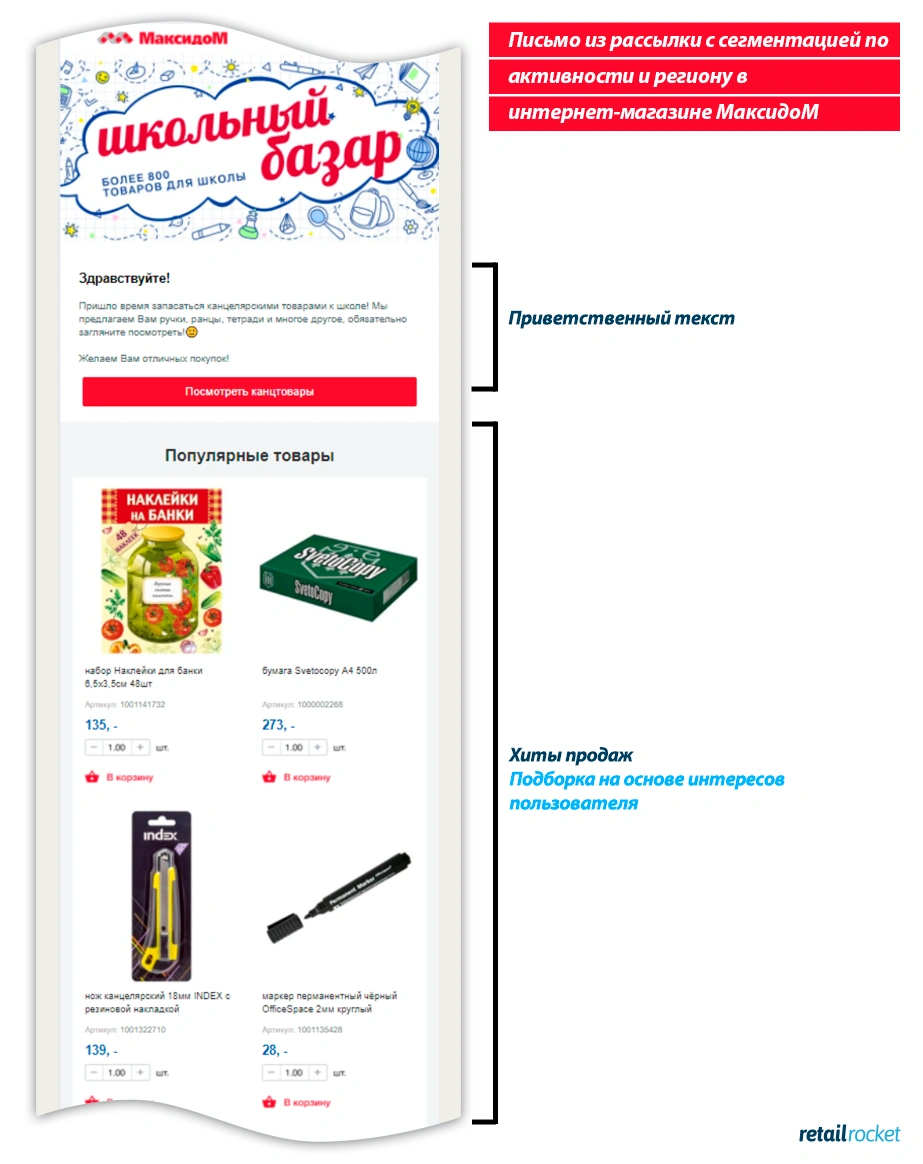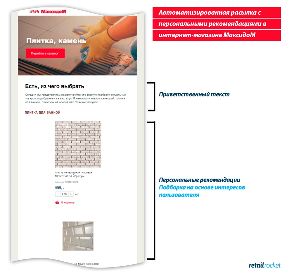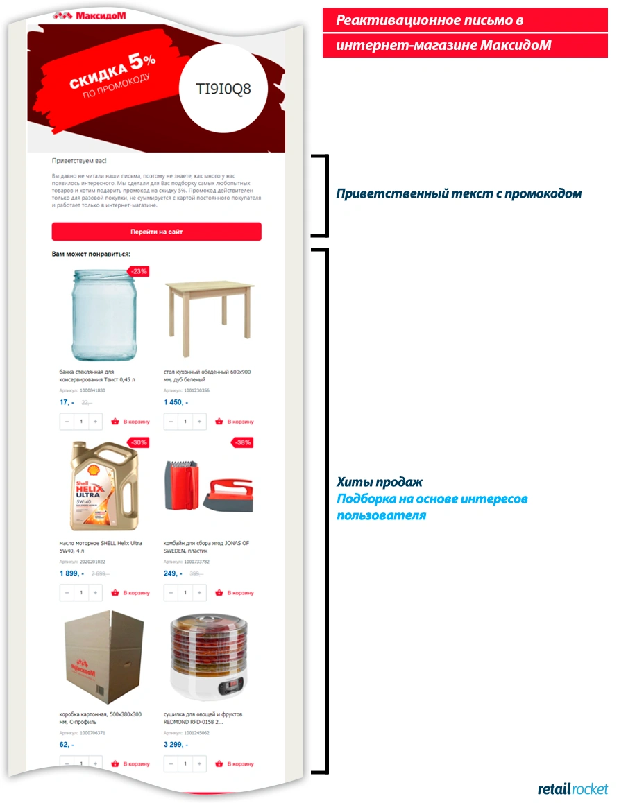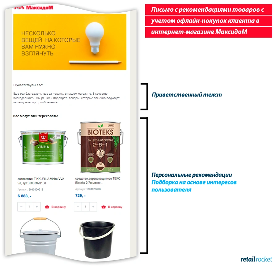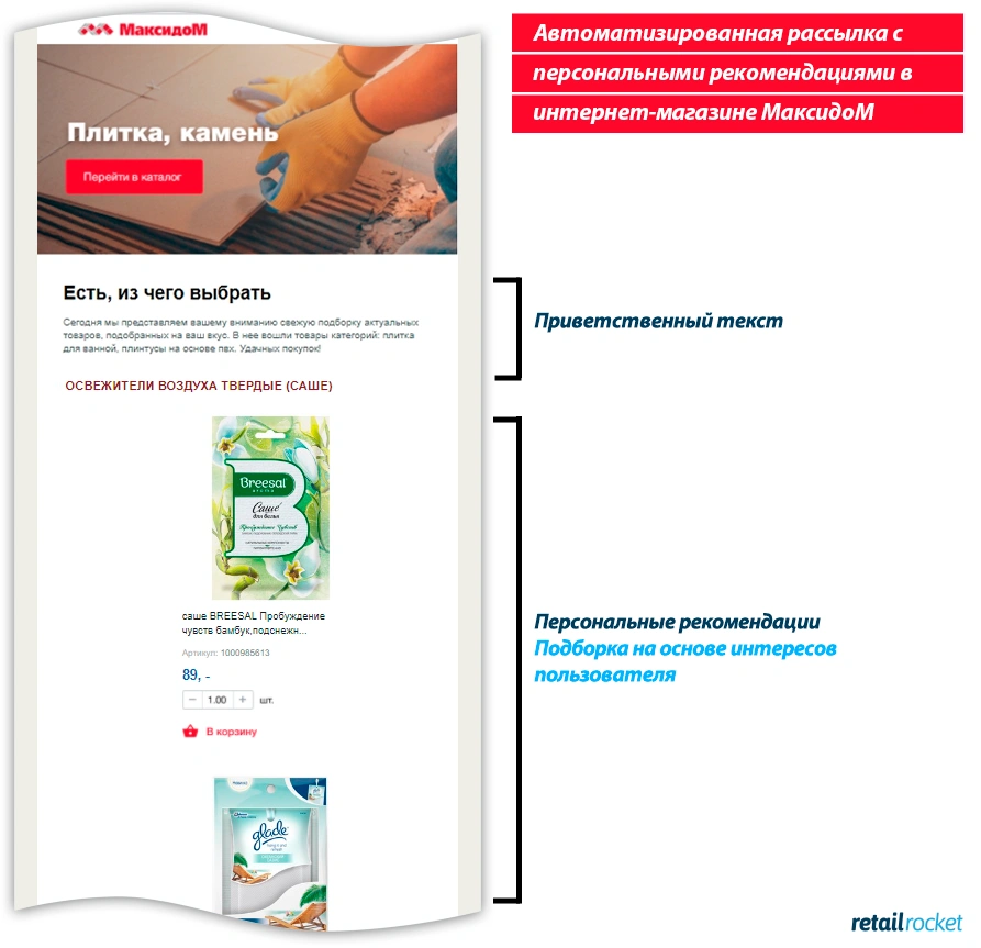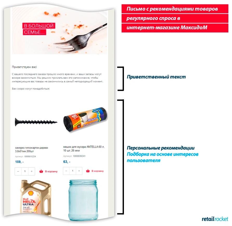 Зная, когда и что покупал пользователь, искусственный интеллект может рассчитать цикл, когда и какие товары ему могут вновь понадобиться. И если онлайн-ритейлер не позаботится о пополнении запасов покупателя, это сделает кто-то другой. В интернет-магазине Максидом не упускают возможности вовремя предложить своим клиентам товары регулярного спроса. При этом представителям компании не нужно высчитывать время отправки письма для каждого товара и клиента: за них это делает платформа Retail Rocket. Все, что требуется сделать — однажды сверстать шаблон и запустить триггерный сценарий. Благодаря этому клиенты теперь получают такие письма: