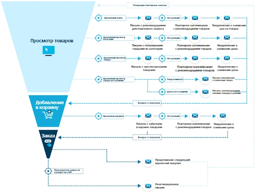 Грамотная реакция на поведение пользователя позволяет возвращать его в интернет-магазин снова и снова. Для каждого шага клиента по этапам customer journey предусмотрены сообщения, которые автоматически отправляются ему на электронную почту и мотивируют на конкретные действия.