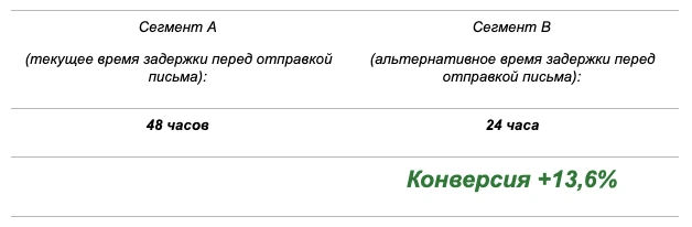 Изменение минимального времени до отправки следующего письма тому же пользователю с 48 часов до 24 часов увеличивает конверсию на 13,6%. Статистическая достоверность результатов теста 95,7%.