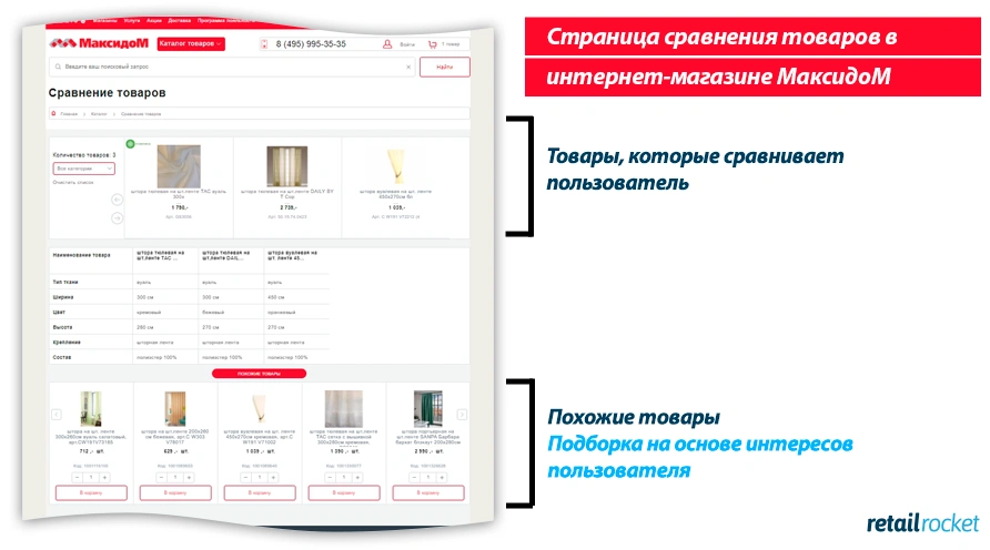 Блоки с товарными рекомендациями внедрены на 15 наиболее посещаемых страницах интернет-магазина МаксидоМ. На каком бы этапе customer journey ни находился пользователь, алгоритмы подберут товары, соответствующие его потребностям в данный момент времени.