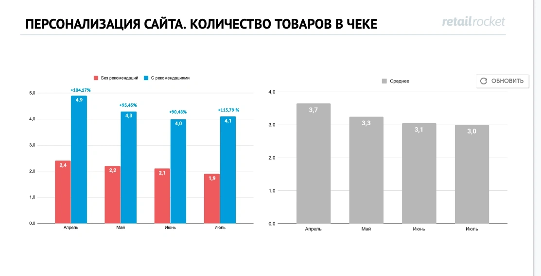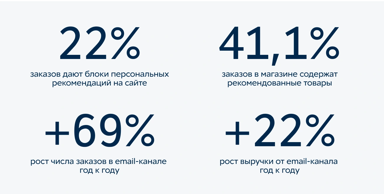 Главная задача — обеспечить каждому клиенту персонализированный подход в интернет-магазине и email-канале с учетом его поведения в сети и физических торговых точках компании. А также повысить выручку, количество заказов и LTV клиентов с помощью искусственного интеллекта.
