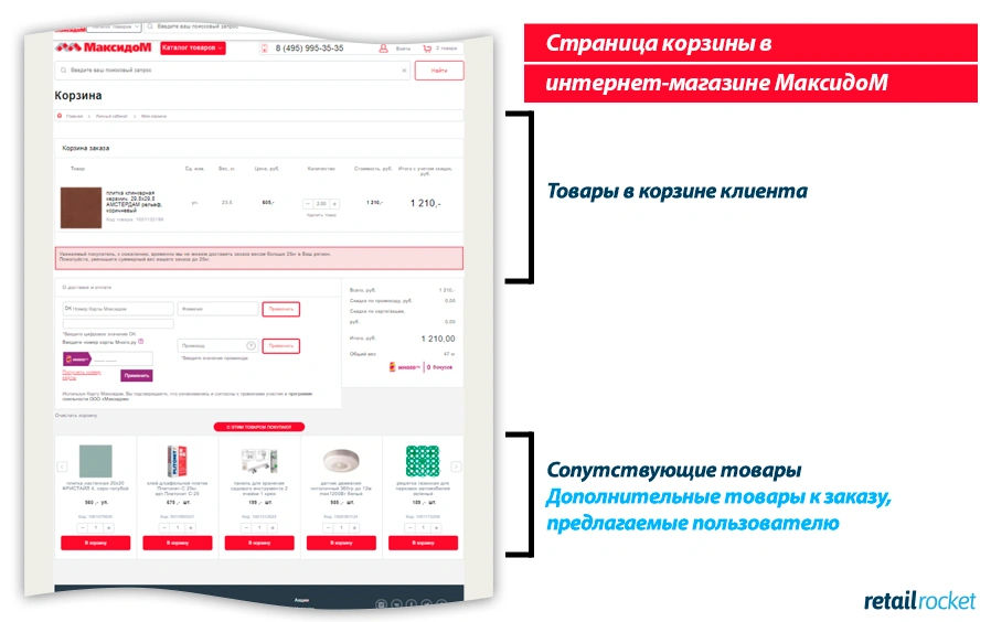 Пользователь на странице корзины подобен покупателю, который стоит возле кассы в физическом магазине. Еще немного, и он совершит покупку. Однако, зная товары в его корзине, не поздно предложить ему что-либо дополняющее заказ. Так, к кафельной плитке наверняка может понадобиться строительный клей. Правильно подобранные сопутствующие товары на странице корзины позволят пользователю не упустить нужную вещь, а интернет-магазину — повысить благодаря этому свой средний чек.