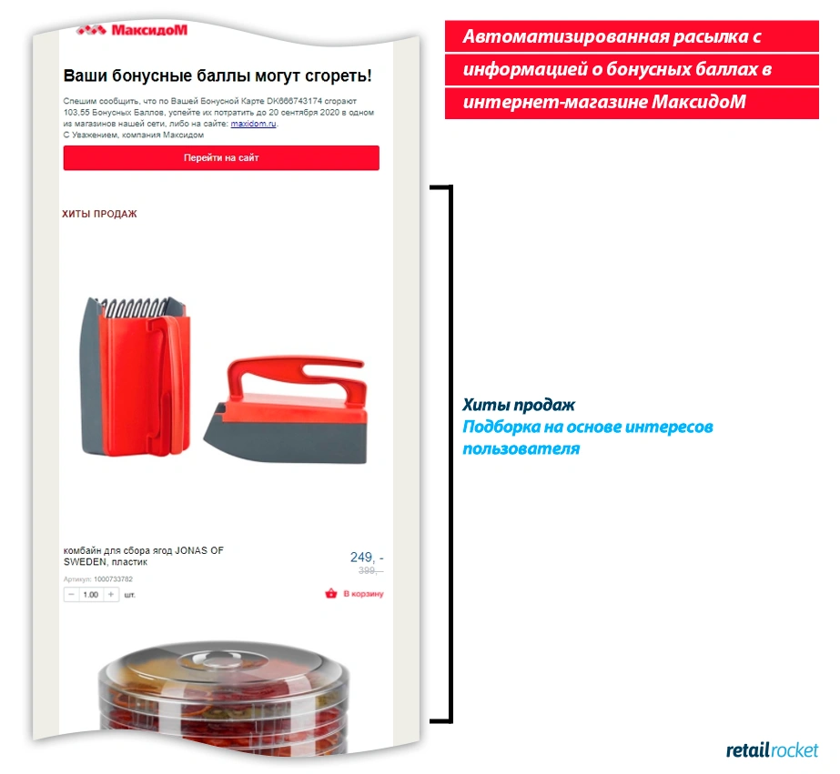 Еще один тип рассылки, который можно с успехом автоматизировать — информирование пользователей о баллах в программе лояльности. Сообщение о том, что накопленные баллы скоро сгорят, обладает проверенным FOMO-эффектом, и синдром упущенной выгоды исправно приводит в интернет-магазин часть получателей. Автоматизация этого процесса позволила интернет-магазину МаксидоМ проявлять заботу о клиентах, выстраивая с ними долгосрочные взаимовыгодные отношения с помощью подобных писем: