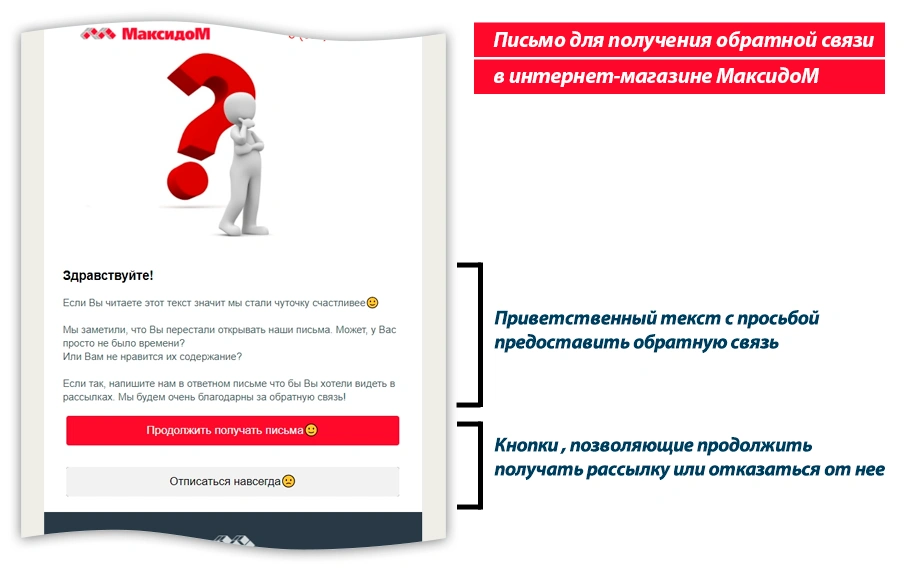 Важно помнить, что коммуникация с клиентами предполагает двустороннюю связь, и нет лучшего источника идей по улучшению сервиса, чем отзывы самих покупателей. Особенное значение имеют отзывы тех, кто по каким-либо причинам перестал заходить на сайт. Выяснить эти причины — задача маркетологов компании. Именно поэтому интернет-магазин МаксидоМ отправляет им отдельное письмо с просьбой дать обратную связь.