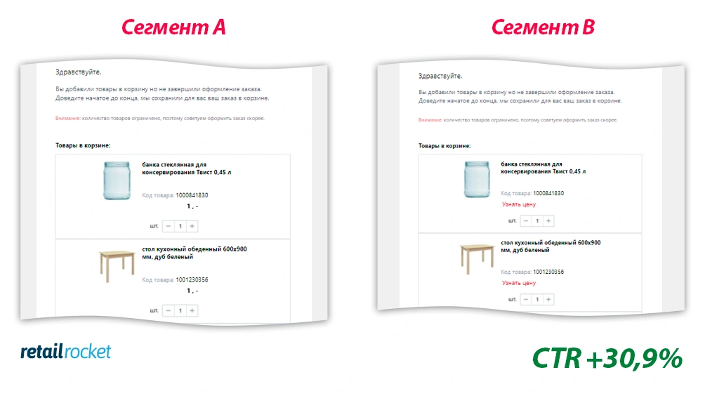 Если мы не будем сообщать в письме цену товаров, а вместо этого добавим текстовый CTA-элемент «Узнать цену», заинтересованный покупатель перейдет на сайт интернет-магазина.