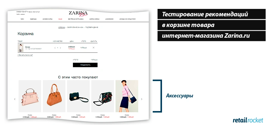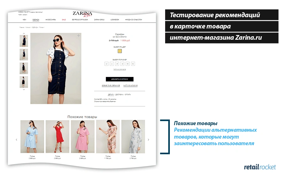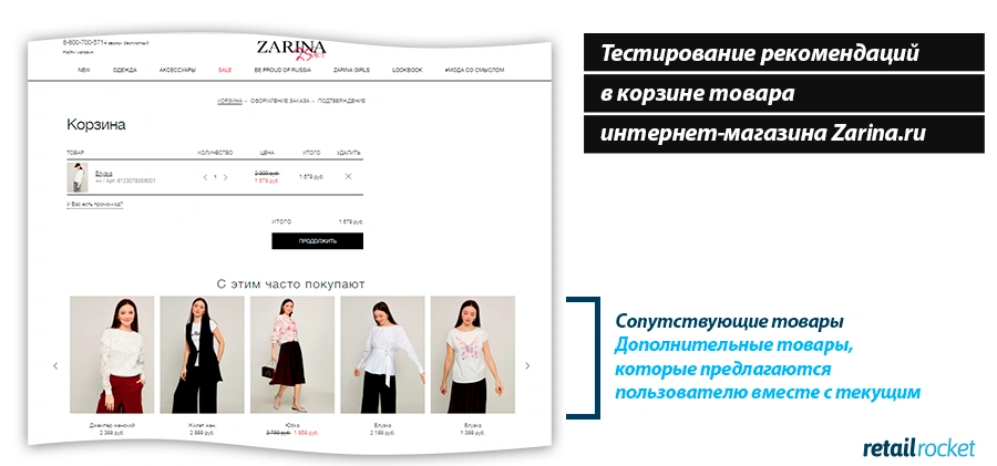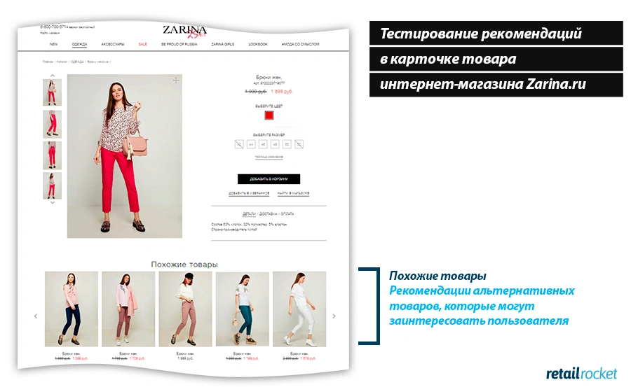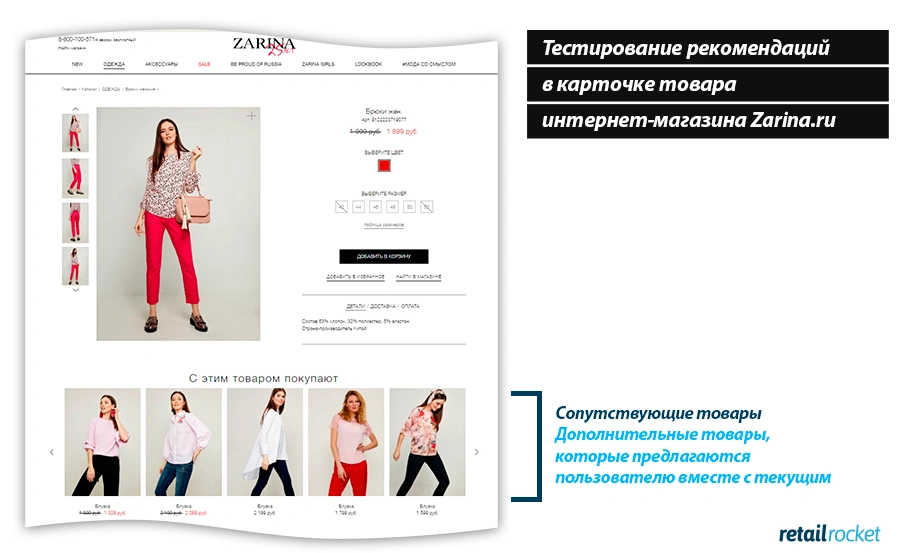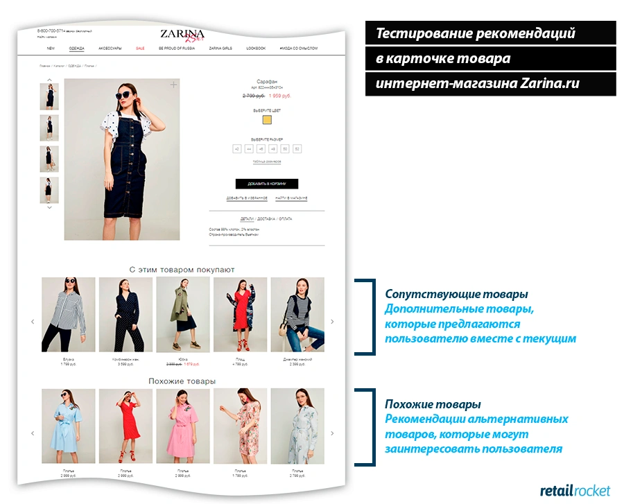 В карточке товара на сайте Zarina.ru было протестировано несколько алгоритмов и вариаций расположения блоков товарных рекомендаций, чтобы определить, какой из них имеет большую конверсию и приносит большую выручку.