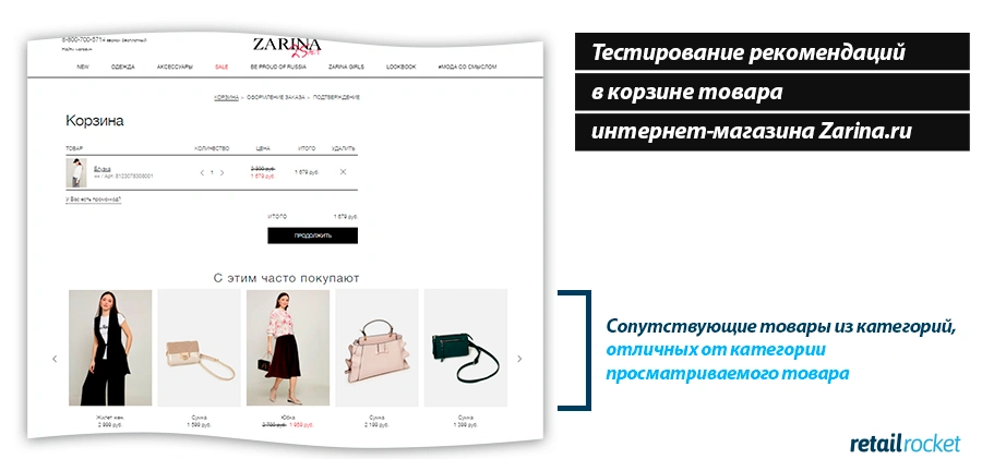По итогам теста рекомендации сопутствующих товаров из категорий, отличных от категории просматриваемого товара, в корзине интернет-магазина Zarina.ru увеличивают конверсию целевых посетителей на 11,6% со статистической значимостью 98,1%, что в сочетании с ростом среднего чека на 3,91% приводит к прогнозируемому росту выручки на 16%.