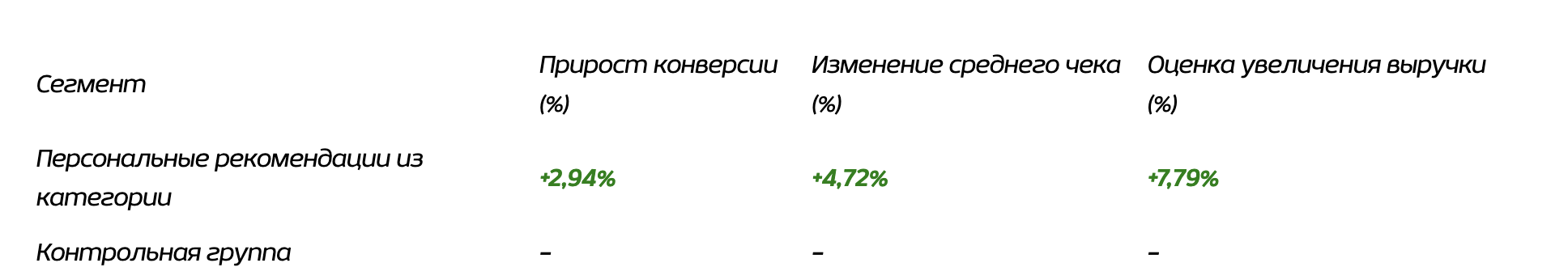 По итогам теста наилучший результат на странице категории интернет-магазина Zarina.ru показала механика «Персональные рекомендации товаров из категории». Прирост конверсии составил 2,94%, что в сочетании с повышением суммы среднего чека на 4,72% обеспечивает прогнозируемый рост выручки на 7,79%.