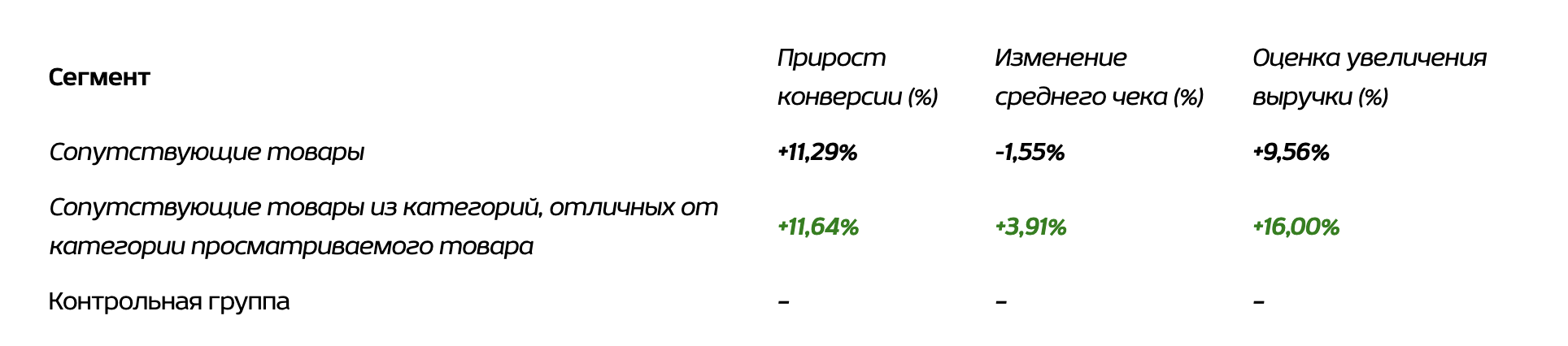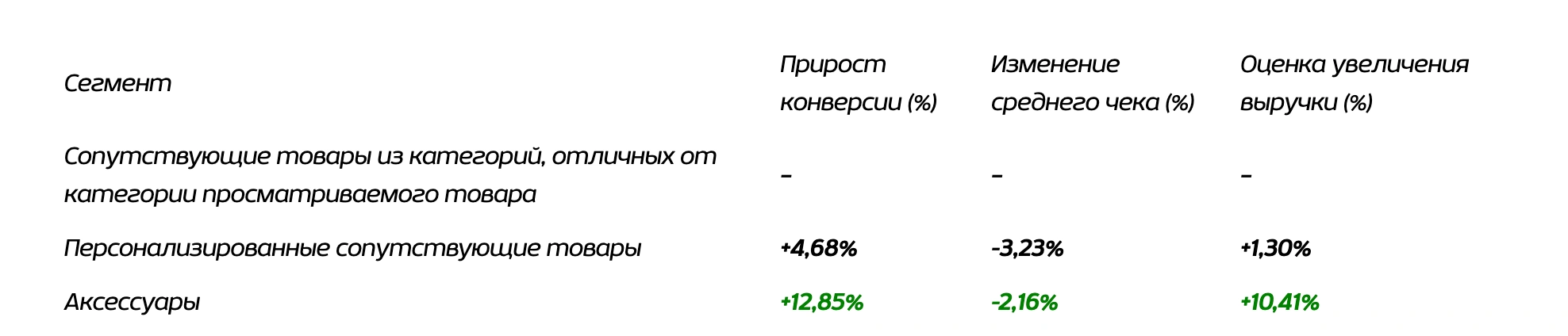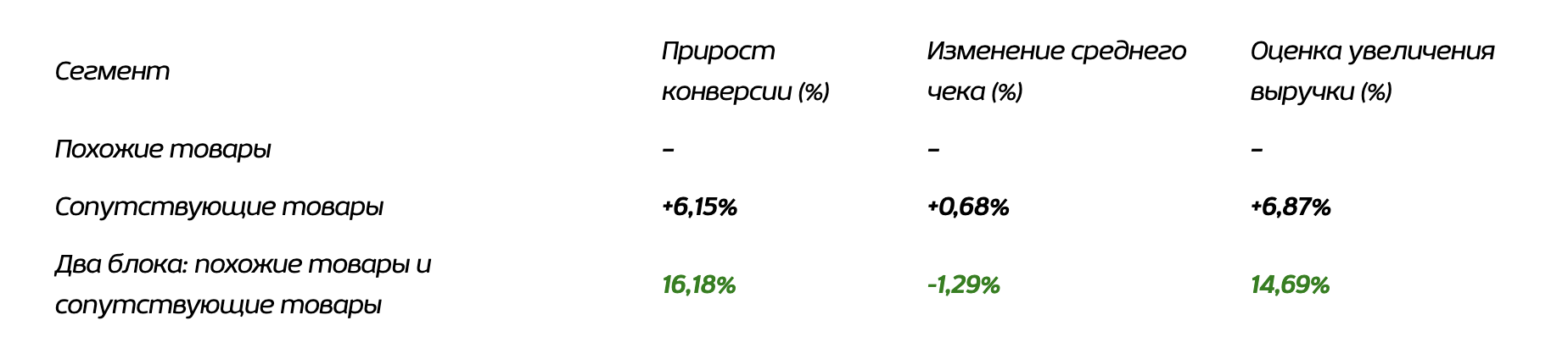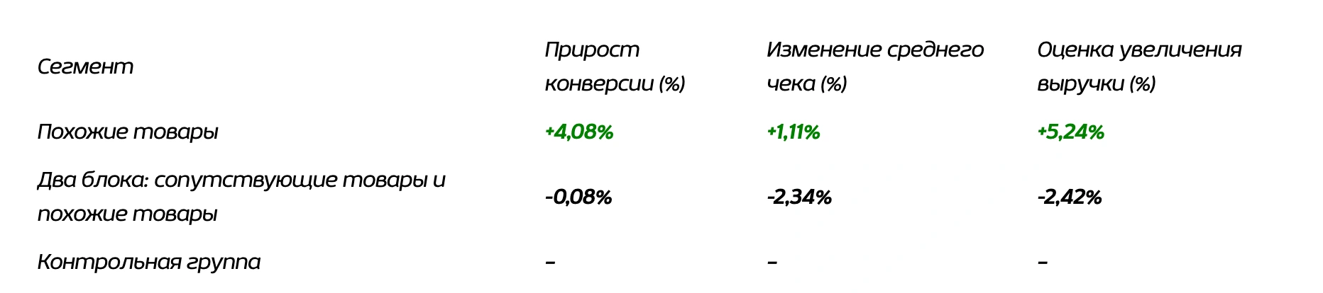 Лучший результат показала механика «Похожие товары». Ее применение позволило увеличить конверсию на 4,08%, а средний чек на 1,11%, что в сумме обеспечивает прогнозируемый рост выручки на 5,24%.