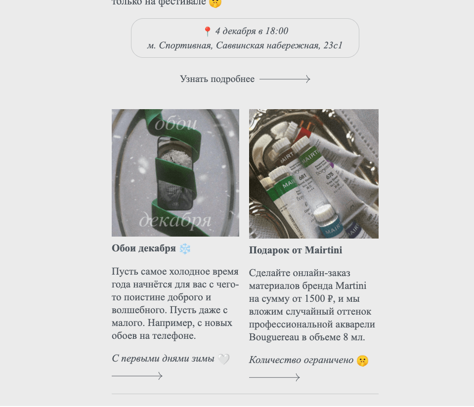 Массовые рассылки «Красного Карандаша» выделяются нестандартным подходом к контенту. Помимо стандартных промо-предложений, маркетолог компании добавляет в письма ссылки на скачивание обоев для телефона, плейлисты и другой lifestyle-контент. Это работает на вовлеченность и формирует эмоциональную связь с аудиторией творческих людей.