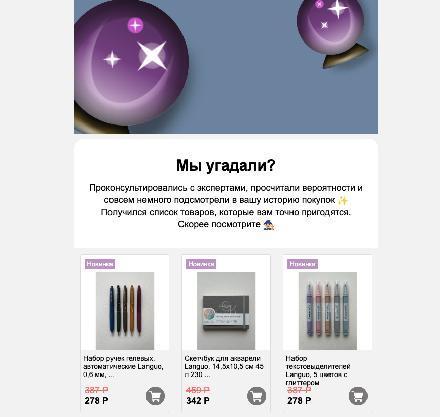 Визуальный редактор автоматизировал самую трудоемкую часть процесса. Теперь товарные блоки подтягиваются динамически: алгоритм сам подбирает релевантные позиции на основе сегмента получателей, проверяет наличие на складе, актуализирует цены. Маркетолог фокусируется на контенте и креативе — том, что действительно влияет на вовлеченность аудитории.
