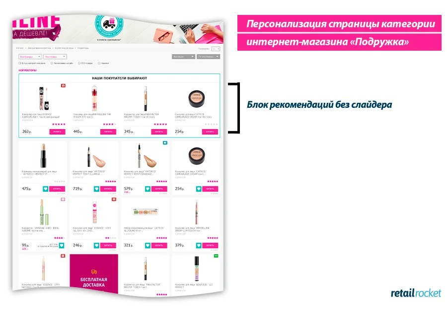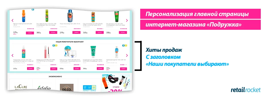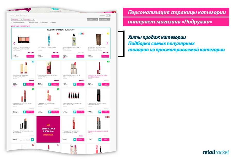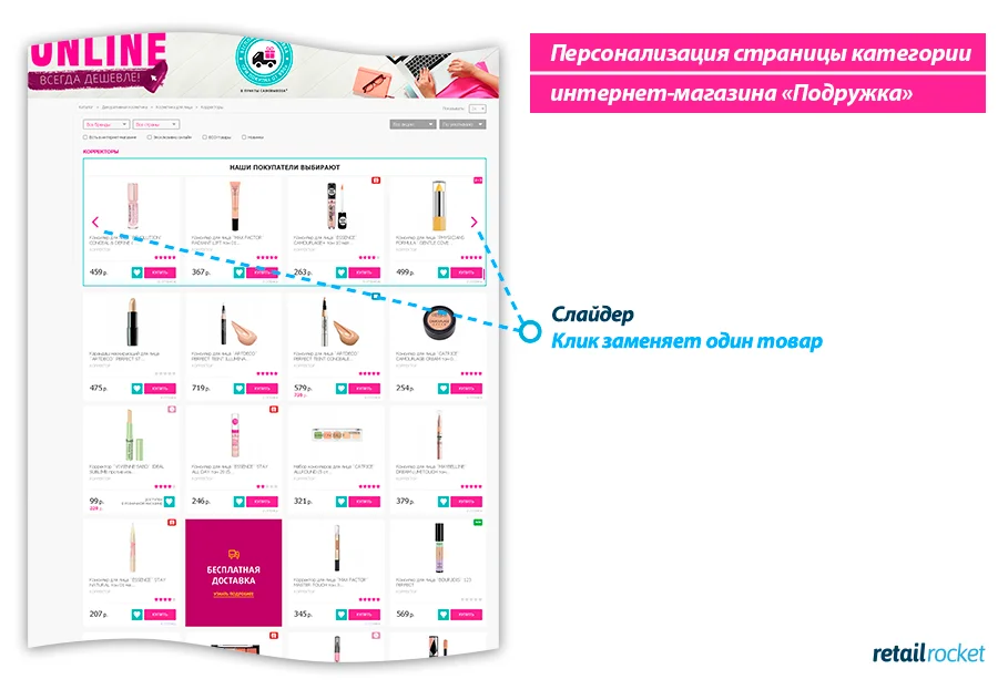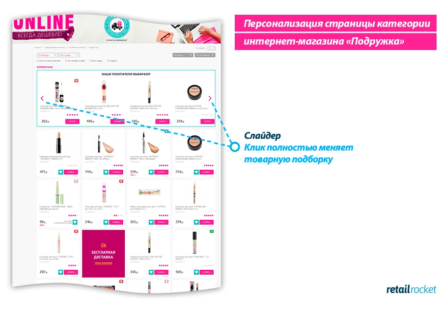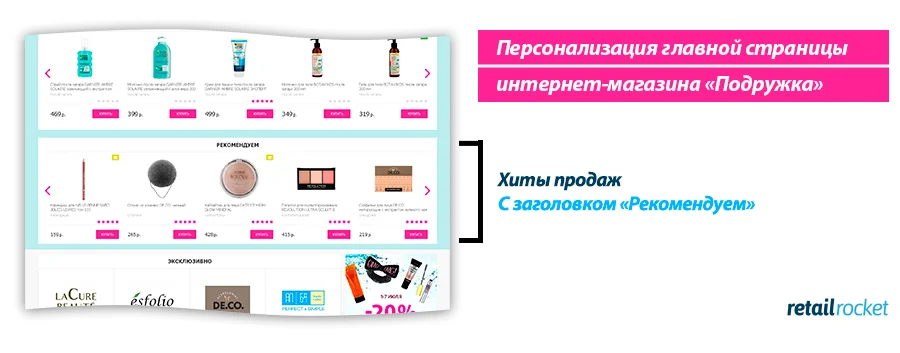 Часто ли вы пользуетесь слайдером в блоках рекомендаций? Удивительно, но для каждого сайта ответы будут кардинально разными. У «Подружки» основная аудитория — девушки. Многие из них визуалы, которые любят рассматривать товары и чем проще это делать, тем интереснее им совершать покупки.