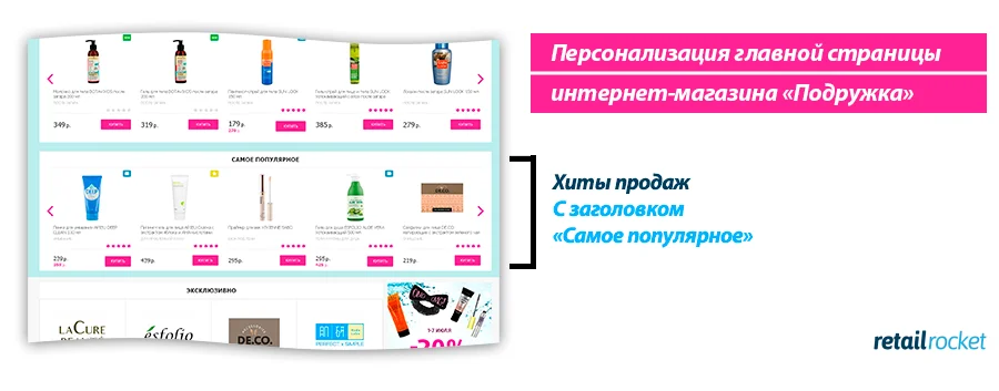 Согласно результатам тестирования, применение механики «Персональные рекомендации (сверху) и хиты продаж (снизу)» на главной странице интернет-магазина Podrygka.ru увеличивает конверсию на 7,8%. В сочетании с падением среднего чека на 2,7%, это даёт прогнозируемый прирост выручки на 5%.