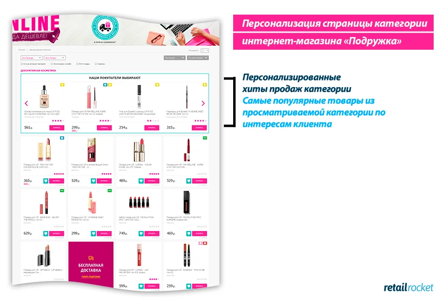 Согласно результатам тестирования, применение механики «Персонализированные хиты продаж в категории» на странице категории интернет-магазина Podrygka.ru увеличивает конверсию на 6,7%. В сочетании с падением среднего чека на 1,8%, это даёт прогнозируемый прирост выручки на 4,7%.